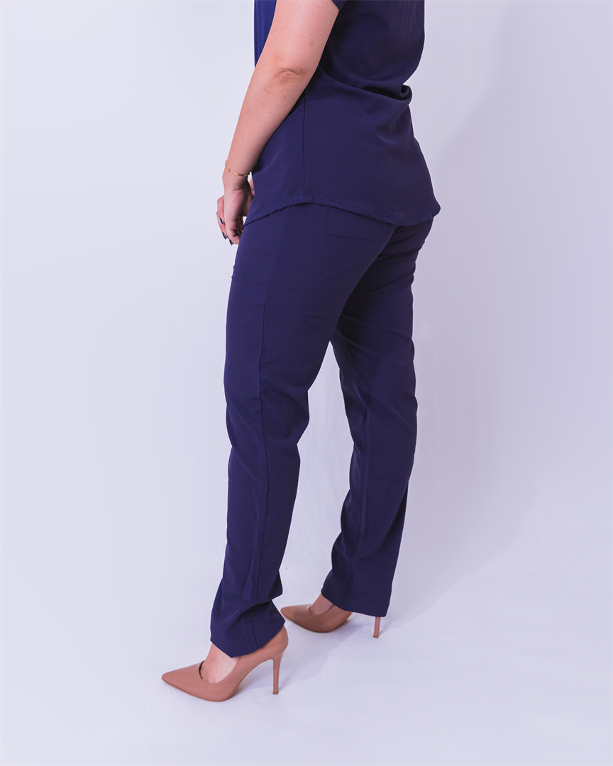 A blusa tem modelagem levemente acinturada, gola em V e três bolsos na parte debaixo da blusa, deixando-a cheia de utilidades. A calça possui elástico cintura, dois bolsos laterais, dois bolsos traseiros e a barra reta