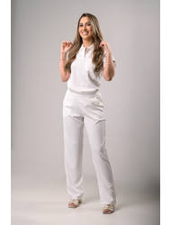 A camisa é uma peça de destaque, caracterizada por sua sofisticada gola polo e uma delicada abertura no decote, adicionando um toque de charme e sofisticação. Com um bolso embutido no peito, a praticidade encontra a moda, proporcionando um visual harmonioso e elegante.
