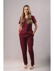 A blusa tem modelagem levemente acinturada, gola em V e três bolsos na parte debaixo da blusa, deixando-a cheia de utilidade A calça possui elástico cintura, dois bolsos laterais, dois bolsos traseiros e a barra reta